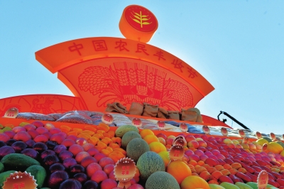 9月23日,首屆中國農(nóng)民豐收節(jié)主會場慶典現(xiàn)場,優(yōu)質(zhì)農(nóng)產(chǎn)品組成的巨型花壇果香色艷,展示著農(nóng)業(yè)綠色發(fā)展成就。