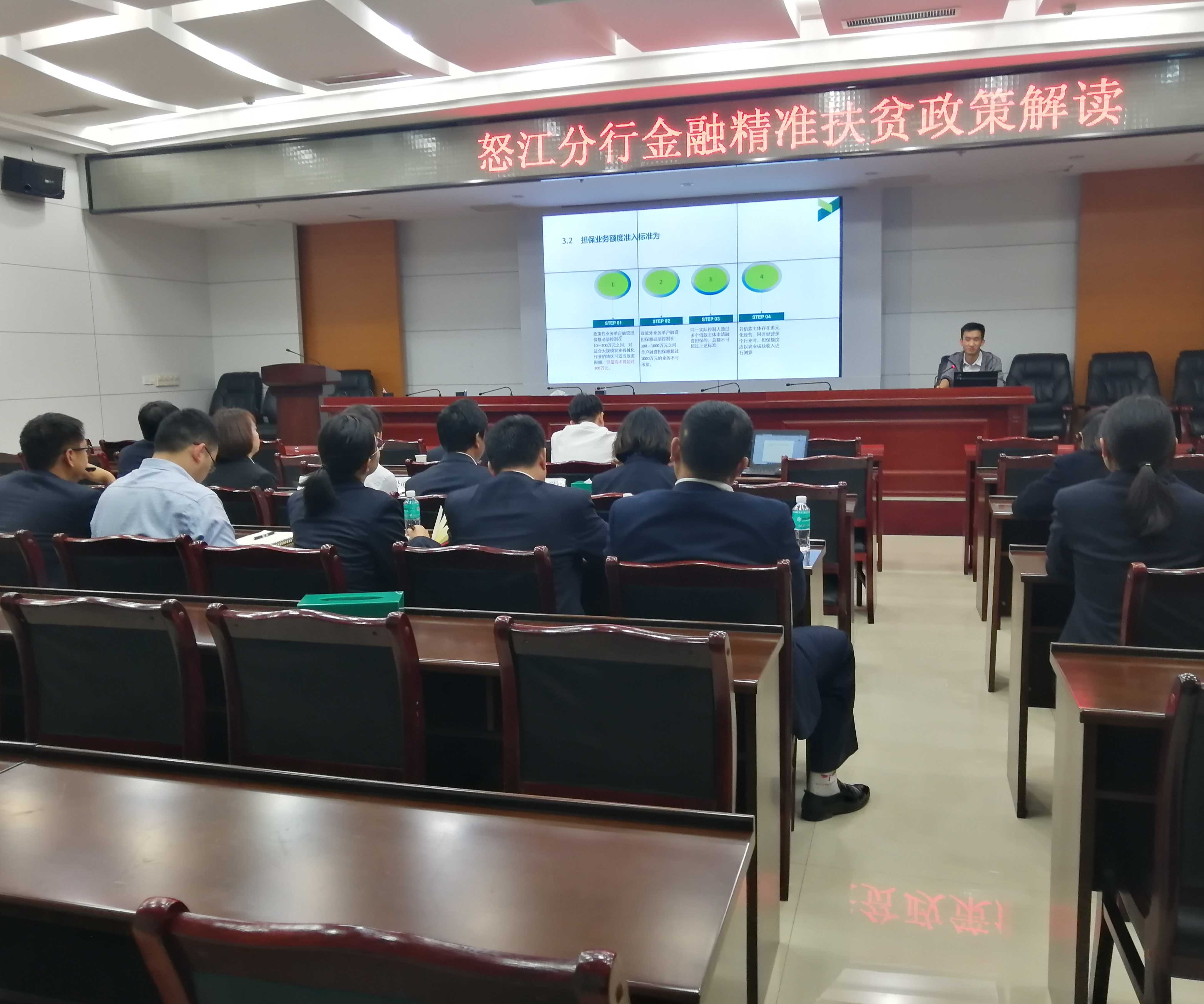 2019年3月27日,瀘水辦事處全體人員參加了農(nóng)業(yè)銀行瀘水市支行的“銀擔保座談會”,并現(xiàn)場開展了業(yè)務(wù)培訓(xùn)。農(nóng)業(yè)銀行怒江州副行長李磊、怒江州副行長段玉珊,瀘水市副行長李婧,和各縣市分行客戶經(jīng)理出席了會議。