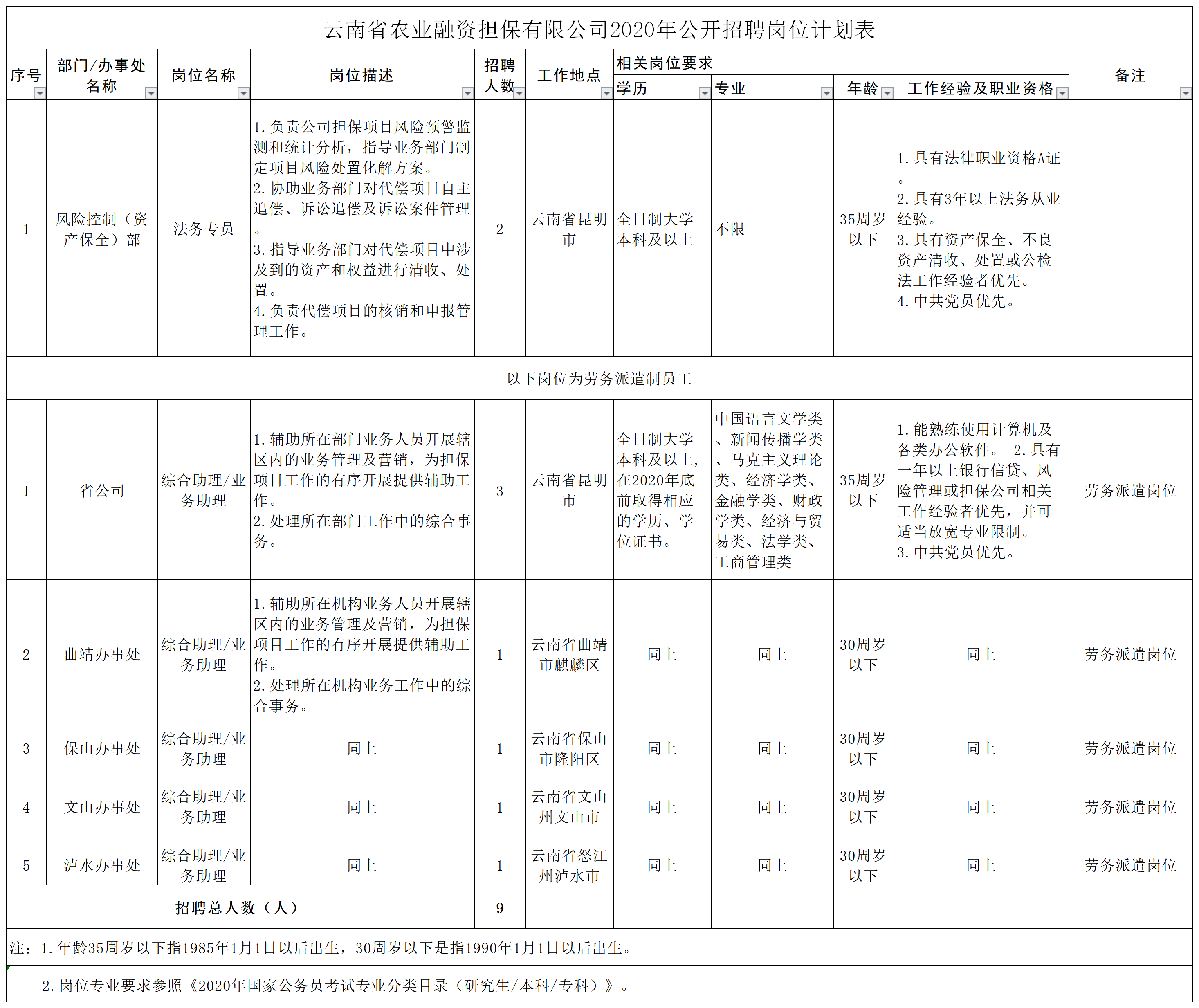 具體崗位及崗位報(bào)名條件詳見《云南省農(nóng)業(yè)融資擔(dān)保有限公司2020年公開招聘崗位計(jì)劃表》(附件)。